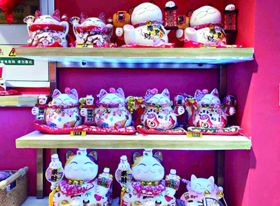 记者刚走进这间小店,就被满屋的招财猫所吸引。店员告诉记者,在这间不到20平方米的小店里,有几百只陶瓷招财猫产品,其中有车内挂件、储物罐等。与普通的招财猫不同的是,这些作品融入了琵琶、梅花、年画儿等中国传统文化元素。